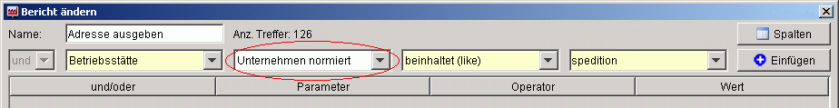7. Nun muss für den entsprechenden Bericht die Ausgabespalte (mindestens eine) bestimmt werden. Denkbar ist z. B. ein Bericht, der für alle Betriebsstätten, die die Zeichenkette "Spedition" im Namen enthalten, die Adresse ausgeben werden soll. Als Ausgabe werden entsprechend die Spalten bs_strasse_norm, bs_plz, usw. angegeben.