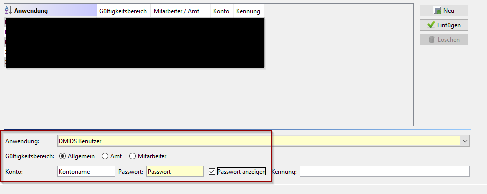 Um die Login Daten (Username und Passwort) für das DMIDS Portal zu hinterlegen, müssen Sie die Anwendung "DMIDS-Benutzer" auswählen und die entsprechenden Daten einpflegen.