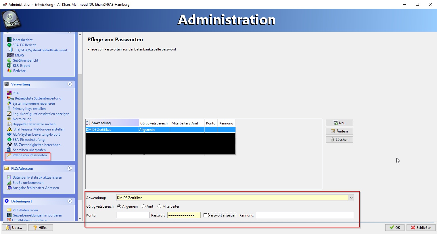 Neben der Passphrase für den Keystore müssen sowohl Nutzername und Passwort für das DMIDS Portals, als auch die Passphrase des Zertifikats (NICHT das Passwort des DMIDS Portals) im Admin Modul im Unterpunkt "Pflege von Passwörtern" hinterlegt werden. Hierzu können Sie auf der Schaltfläche "Neu" ein neues Passwort einpflegen.
