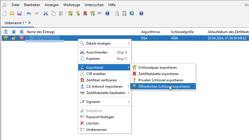 Mit dem Key Explorer lässt sich der öffentliche Schlüssel eines Schlüsselpaars exportieren: