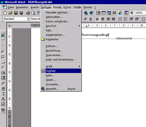 2. Öffnen Sie das Menü Einfügen und wählen Sie den Menüpunkt Textfeld aus.