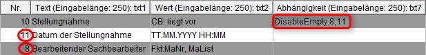 Abhängigkeit (txt7): Durch die Angaben in dieser Spalte können verschiedene Abhängigkeiten definiert werden. So besteht durch die Eingabe von DisableEmpty die Möglichkeit, weitere Zeilen für Eingaben zu sperren, falls in dieser Zeile keine Angabe erfolgt. Über DisableMarked können wiederum Zeilen für eine Eingabe gesperrt werden, falls Werte erfasst werden. Einzutragen sind jeweils die Angaben aus der Spalte Nr..