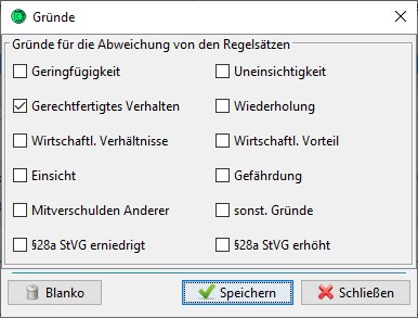 Gründe für das Abweichen von den Regelsätzen werden in diesem Fenster durch das Markieren der vorhandenen Checkboxen bestimmt.